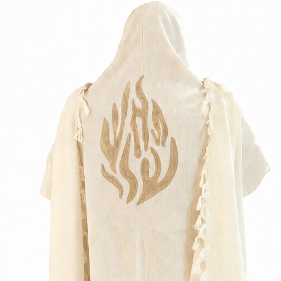 Talith Blanc réalisée sur mesure, orné du motif Flamme Breslev, symbole de foi, lumière et élévation spirituelle.